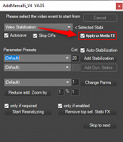 The VEGAS Video Stabilization already tries in 'Freeze motion' mode to reduce the 'additional Zoom' by selection the best fitting reference frame number. This is very close to the optimum, while on some footage the additional zoom may still be reduced a tiny bit. This is now easy possible with the newly added 'Reduce add. Zoom' in AddMercalli_V4 by n% and x-count of events, starting from the selected. Use '0' to apply this change to all following events with Freeze Motion stabilization.
