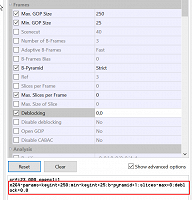 Then add whatever options you want using their dialog. Simply copy the x264- params line as shown and add it to the R+ command line. Two changes are necessary. Rather than x264-params=keyint......, you MUST change it to -x264-params keyint..... A hyphen must be added before x264 and the first colon deleted. Then it should work OK.