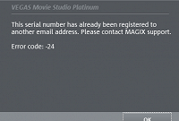 A while ago I bought Movie Studio 17 Platinum, activated it, and used it for a bit. I stopped using it for a bit and came back to it today, but on opening the program, I'm met with the registration window. When I try to enter my email and key I get this: